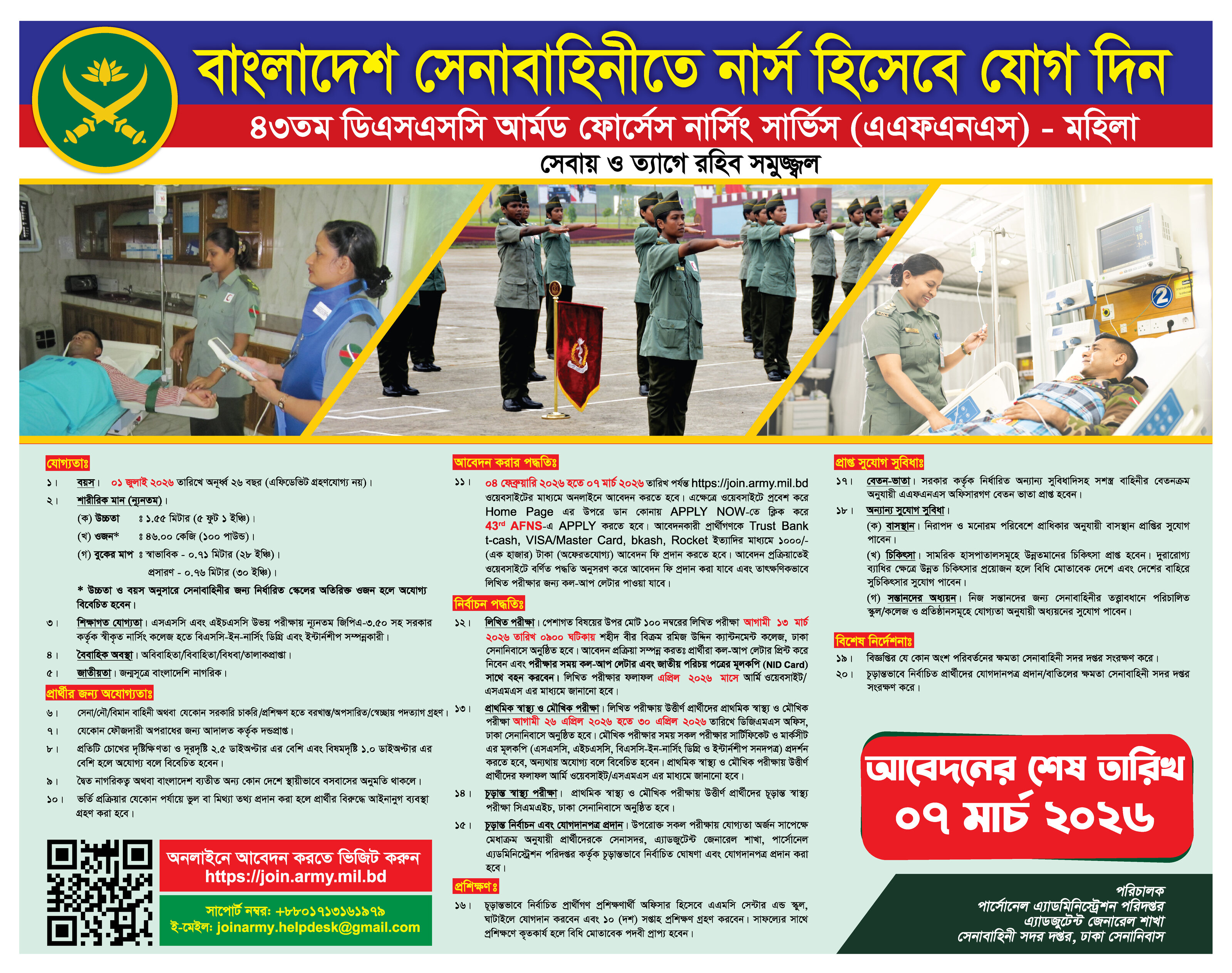 ২। প্রাথমিক স্বাস্থ্য ও মৌখিক পরীক্ষা: লিখিত পরীক্ষায় উত্তীর্ণ প্রার্থীদের প্রাথমিক স্বাস্থ্য ও মৌখিক পরীক্ষা আগামী ২৬ এপ্রিল ২০২৬ হতে ৩০ এপ্রিল ২০২৬ তারিখে ডিজিএমএস অফিস, ঢাকা সেনানিবাসে অনুষ্ঠিত হবে। মৌখিক পরীক্ষার সময় সকল পরীক্ষা সার্টিফিকেট ও মার্কসীট এর মূলকপি (এসএসসি, এইচএসসি, বিএসসি-ইন-নার্সিং ডিগ্রি ও ইন্টার্ণশীপ সনদপত্র) এবং কল-আপ লেটার প্রদর্শন করতে হবে, অন্যথায় অযোগ্য বলে বিবেচিত হবেন। প্রাথমিক স্বাস্থ্য ও মৌখিক পরীক্ষায় উত্তীর্ণ প্রার্থীদের ফলাফল ওয়েবসাইট/এসএমএস এর মাধ্যমে জানানো হবে।